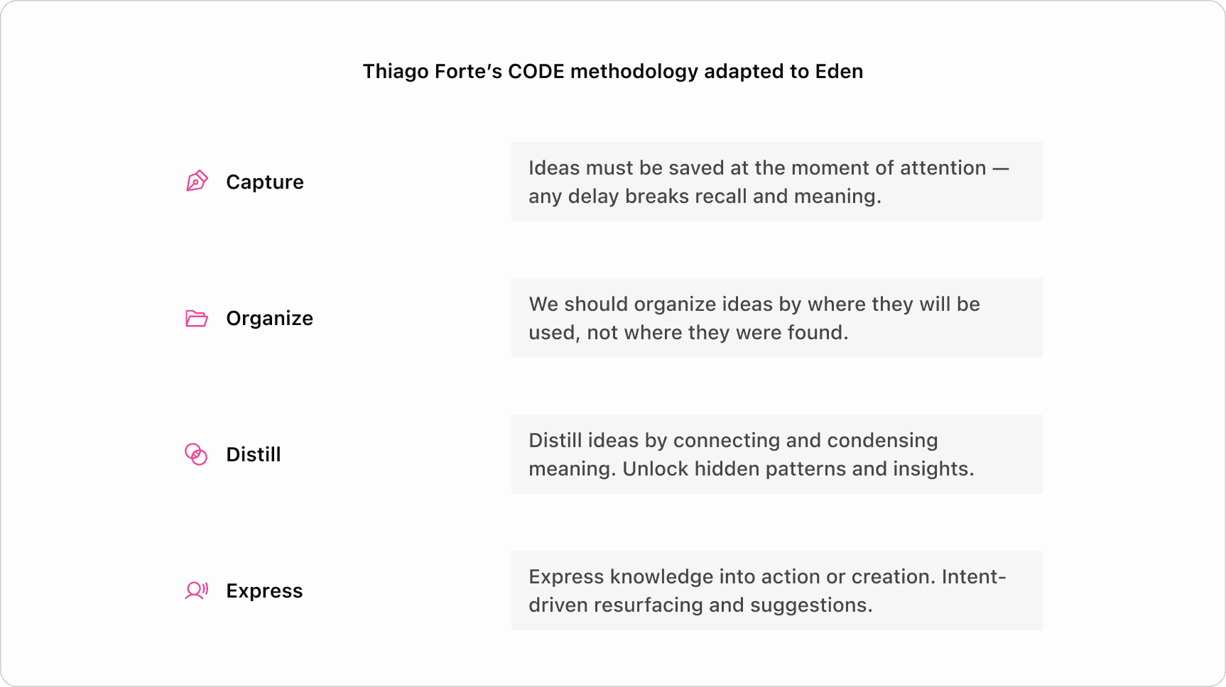 Eden is grounded in Tiago Forte’s second-brain methodology.