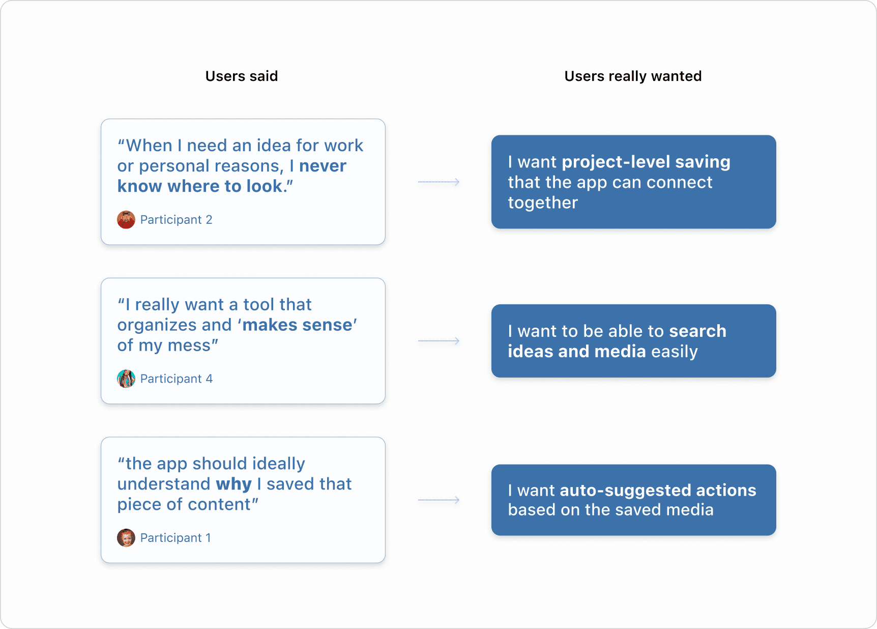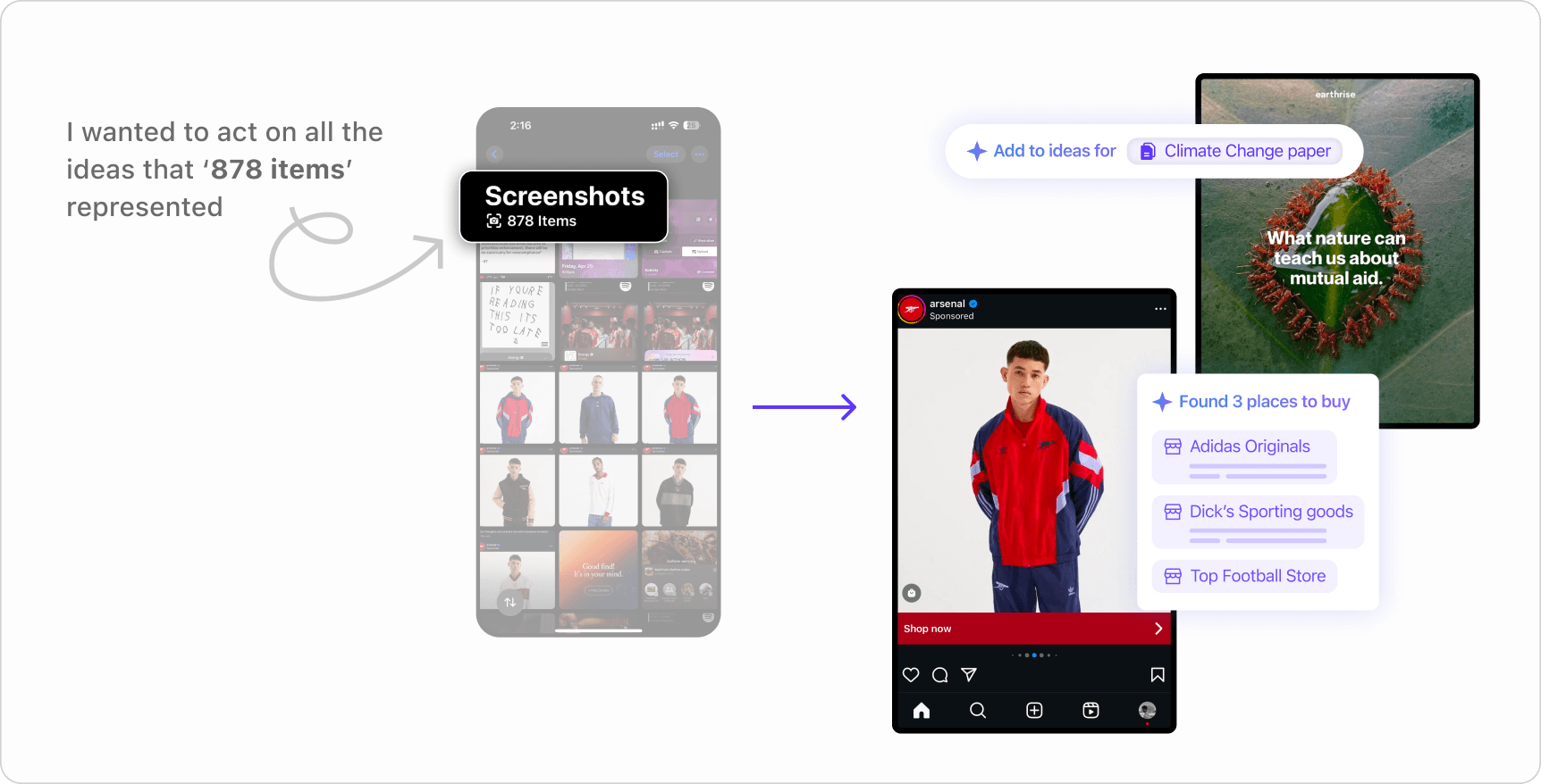 People were collecting inspiration from everywhere, yet nothing was connected or easy to return to. I thought the solution was making screenshots more actionable (seen below). After interviewing users, I learnt that what we really want isn’t more saving, but a system that understands why something was saved and helps turn it into action.